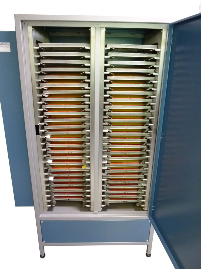 for storage and drying of screen printing stencils of the identical dimensions; the stencils are stored in 2 columns side by side; the measurement for a column must be the same, however, each column may have an individual size! Each column can accommodate 25 stencils, this gives a total capacity of 50 SCREENS;